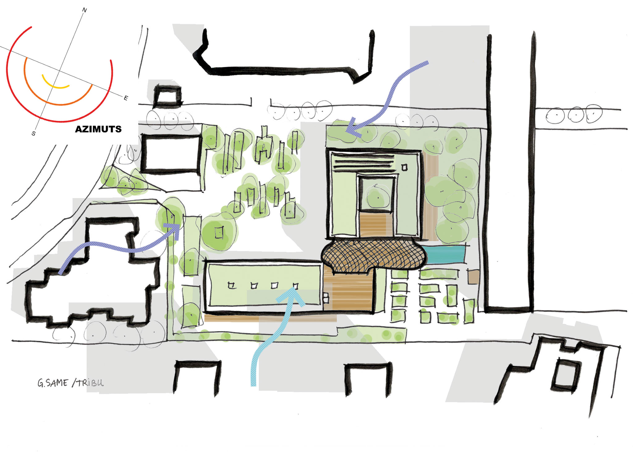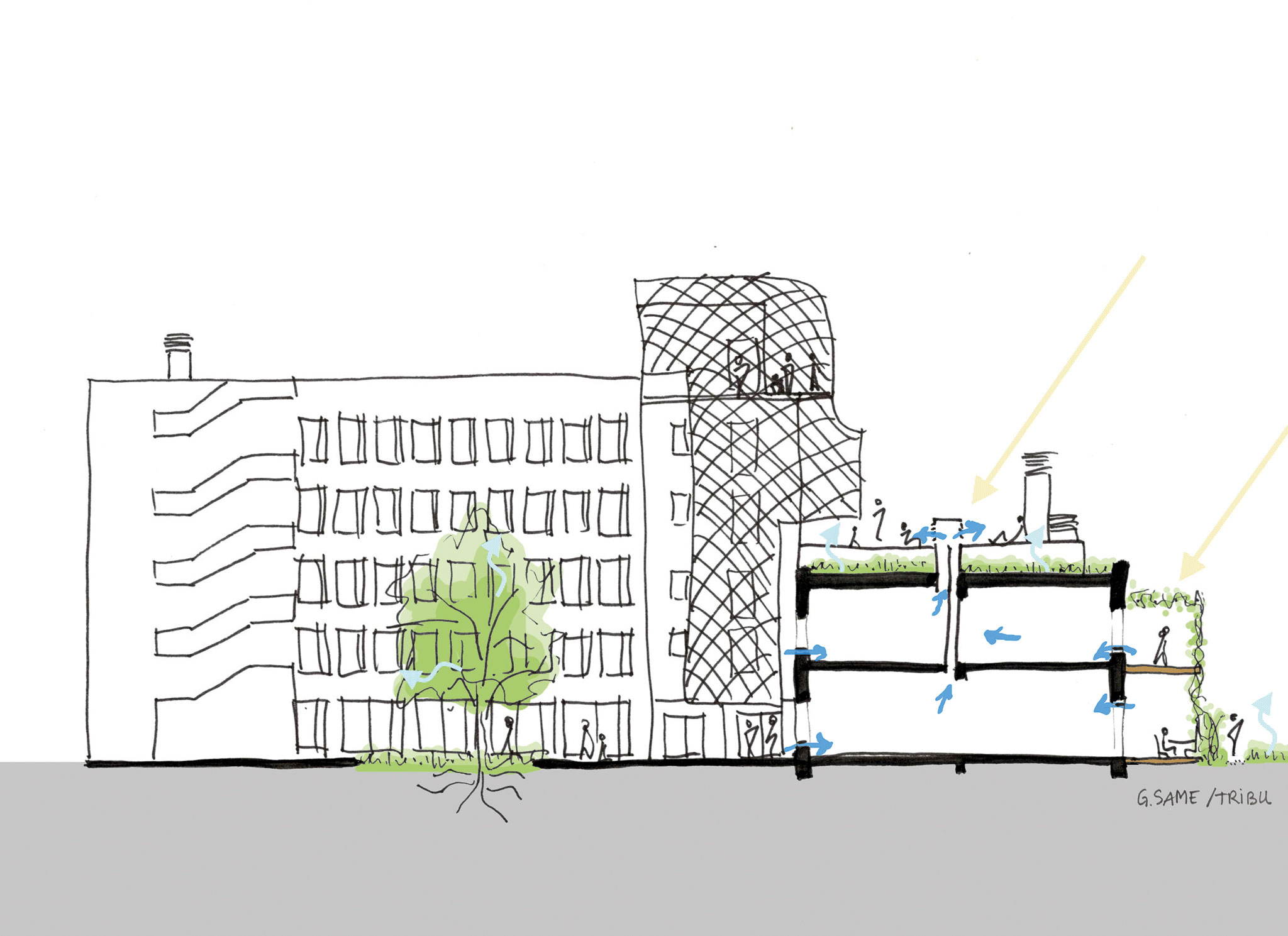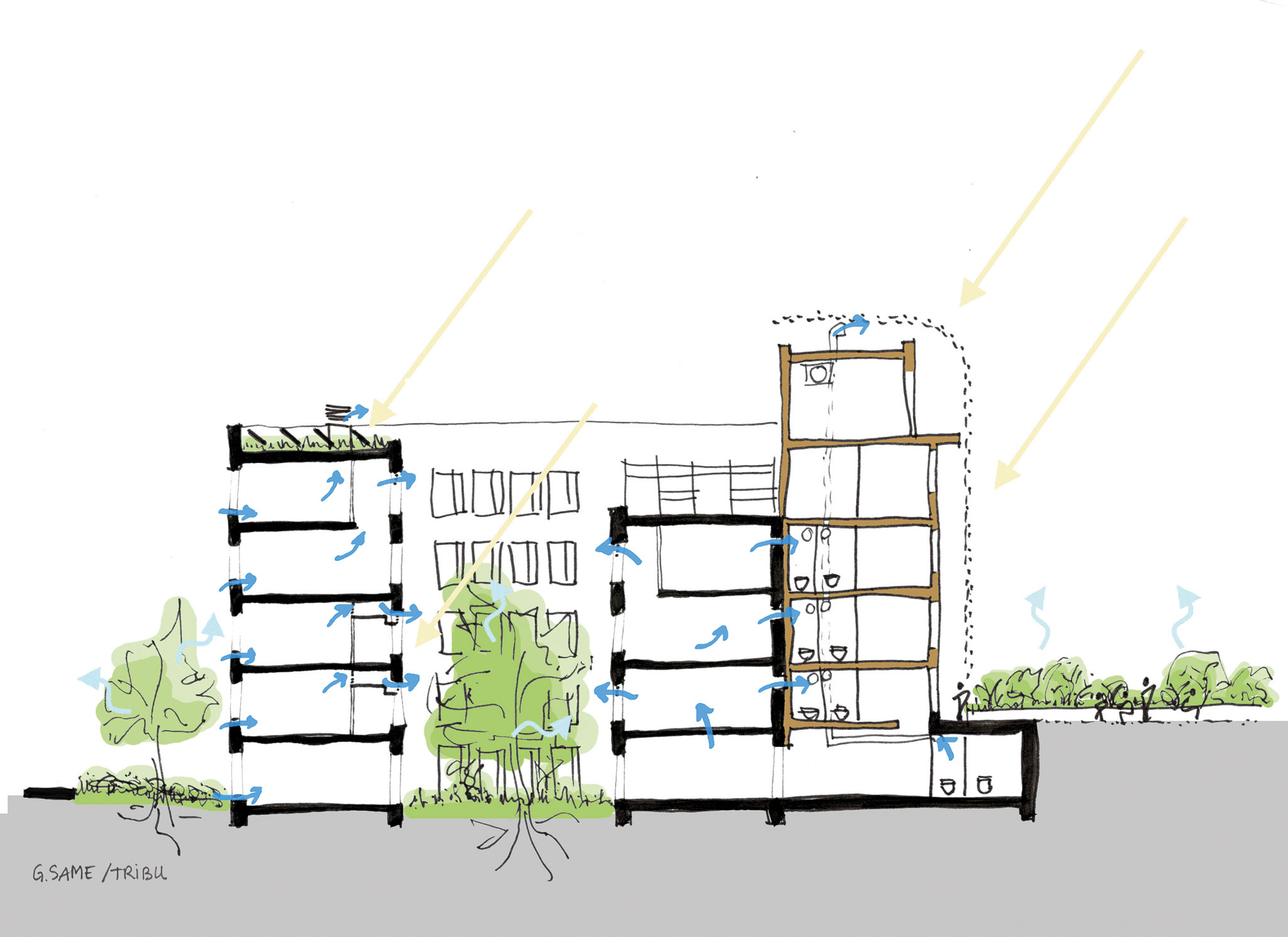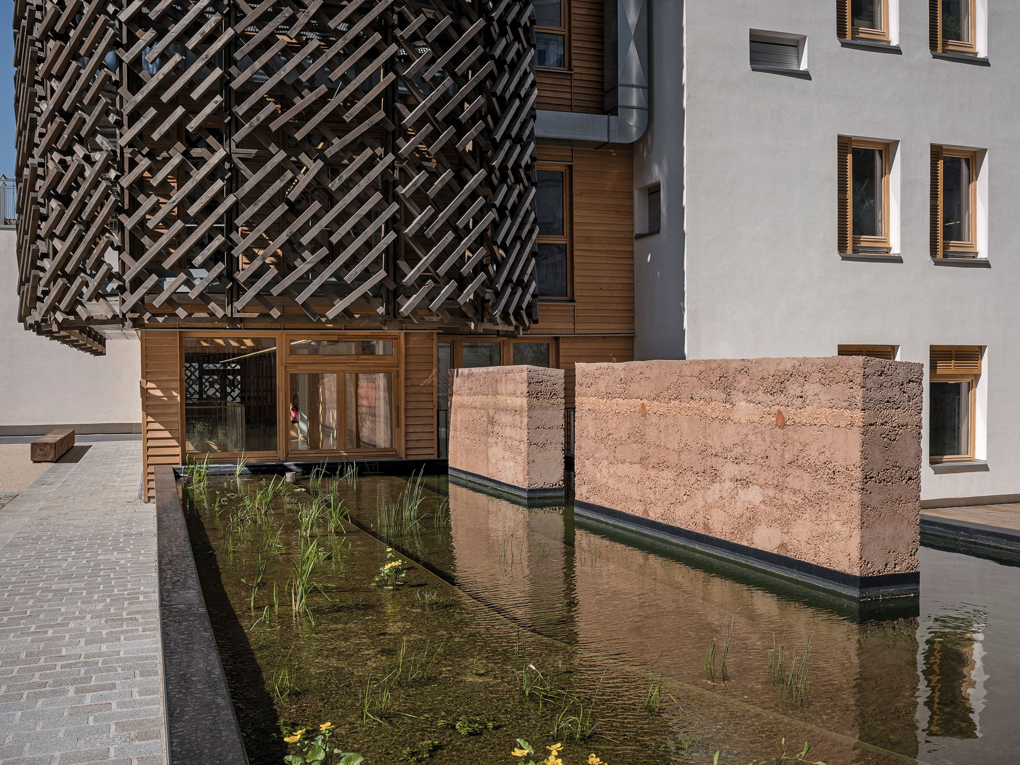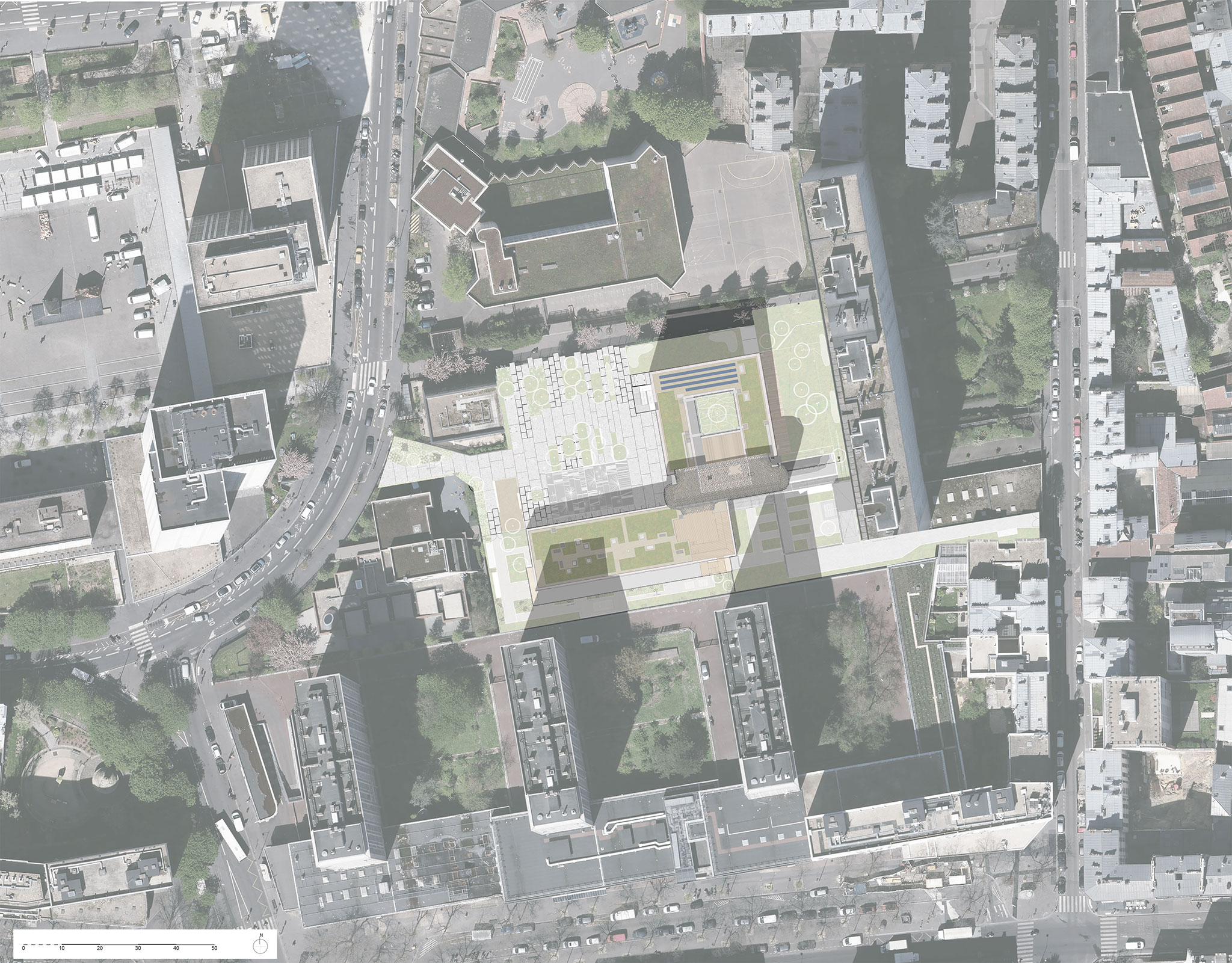 El proyecto invirtió la impermeabilización del 70% de la superficie del solar. El terreno abierto reaparece por doquier, en el patio del centro de la mediateca, en la explanada, en el jardín sombreado, en el jardín compartido y en la terraza de la Casa del Refugiado. El esfuerzo por contrarrestar el efecto de isla de calor urbano se organiza mediante el aumento de las superficies verdes, la implantación de una cubierta vegetal de color claro (losas de hormigón reciclado y arena estabilizada) y un estanque poco profundo entre el jardín compartido y el jardín de sombra.