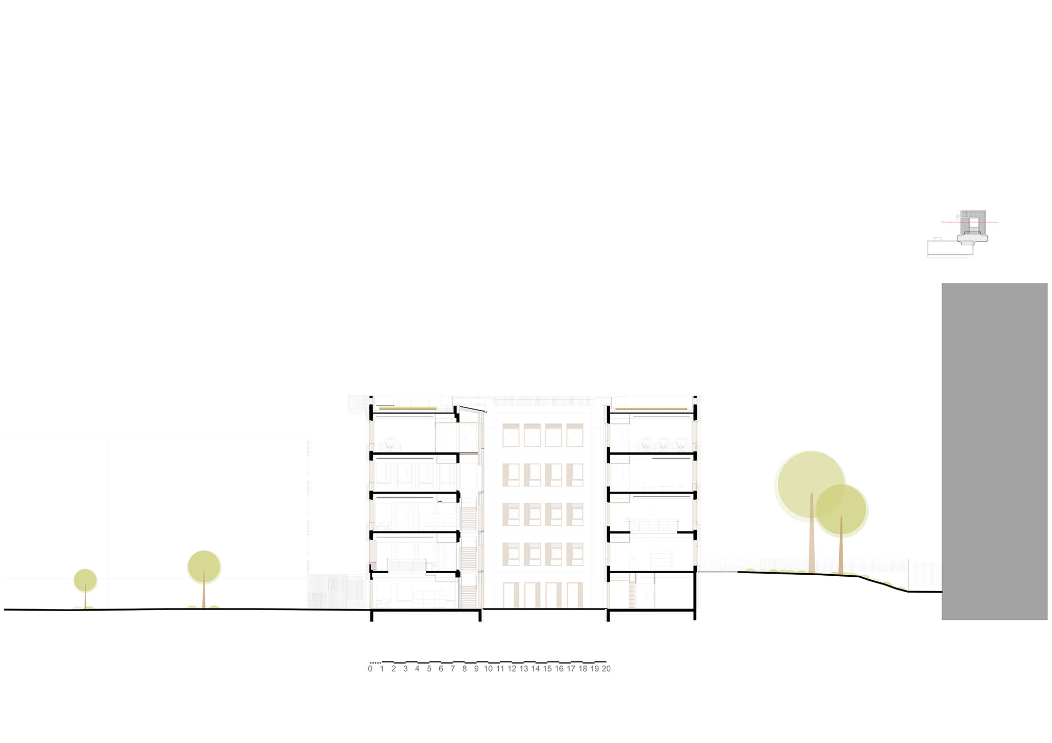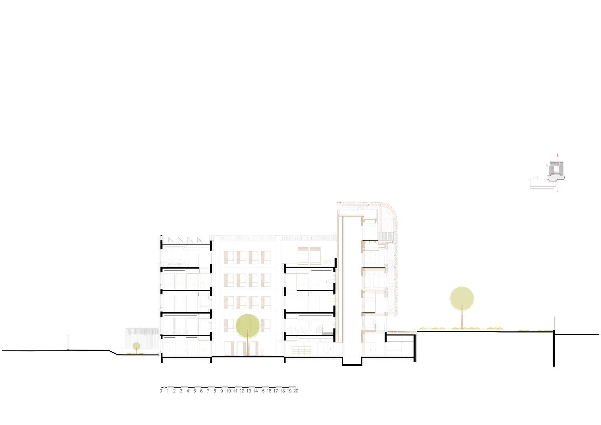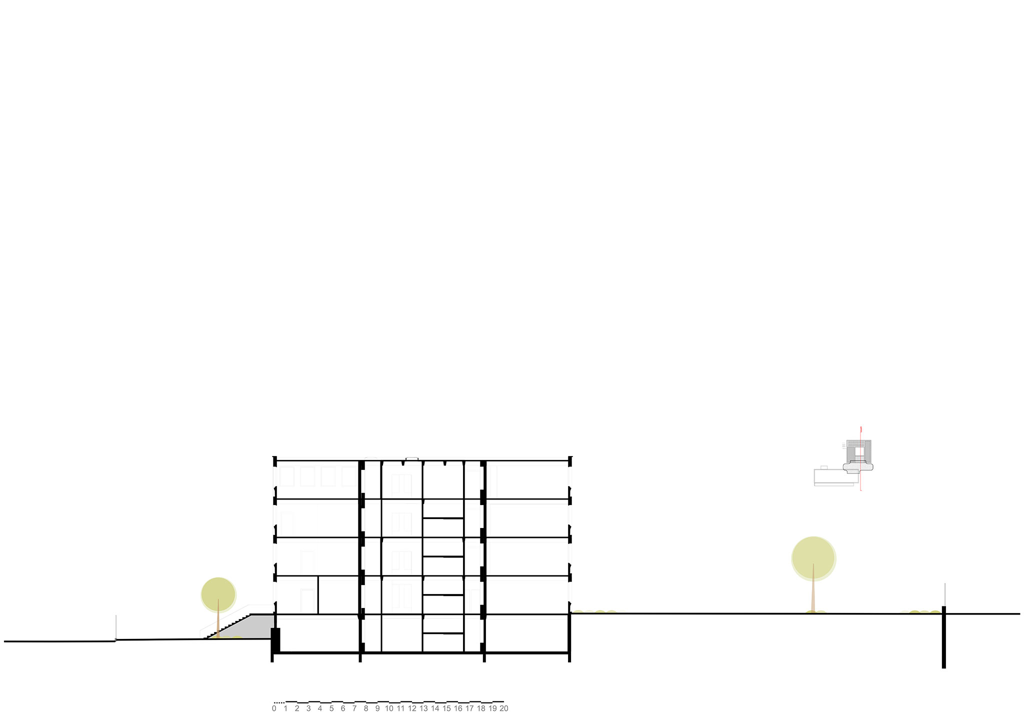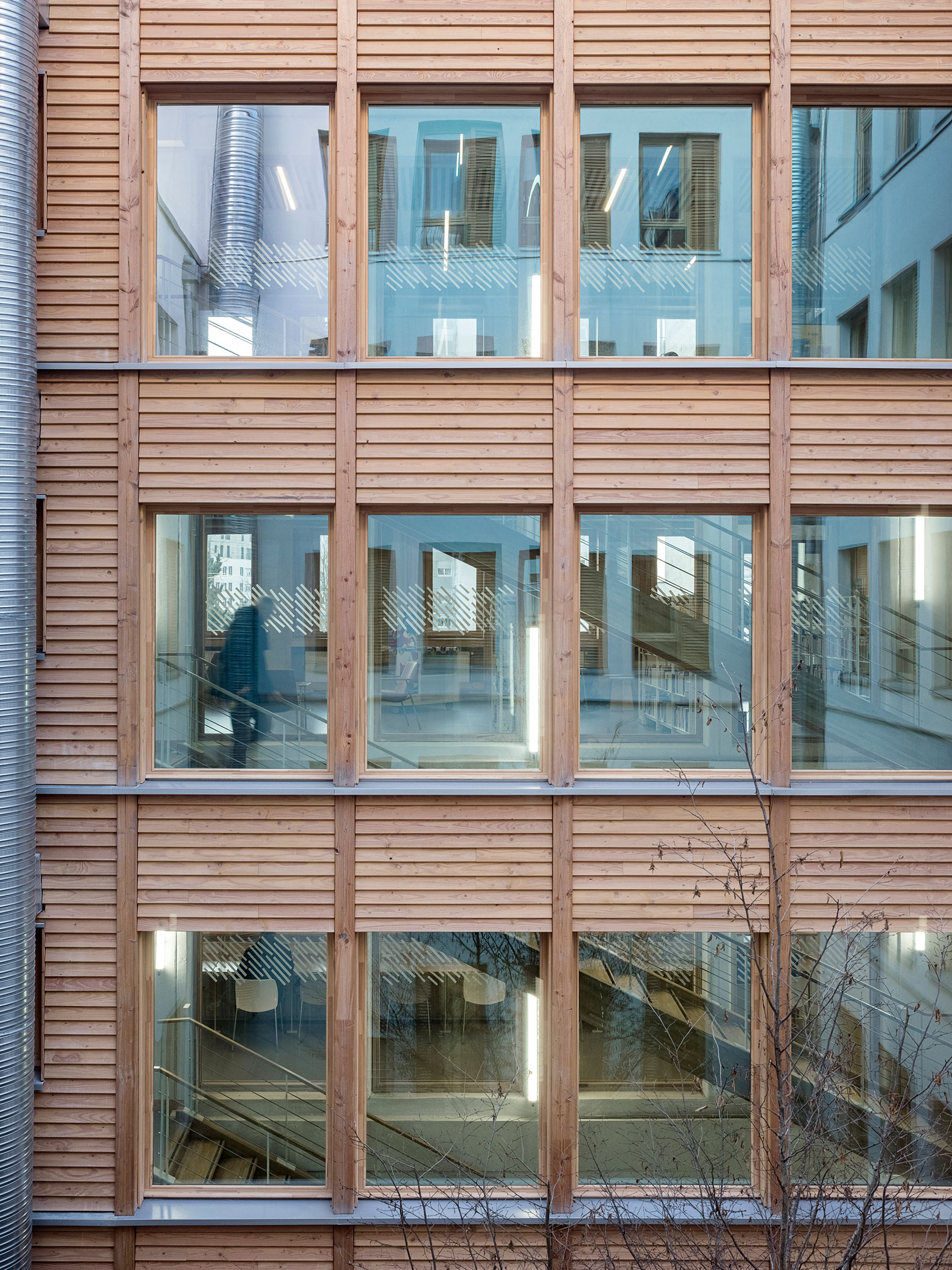 Adoptando un planteamiento ecológicamente responsable, los arquitectos han conseguido renovar a fondo la situación existente con una nueva construcción hecha de material de origen biológico y «geológico». Los edificios, la mediateca cuadrada y la casa de refugiados alargada, están unidos por un volumen vertical, llamado «el enlace», que sirve a los diferentes niveles y espacios de estos dos establecimientos. Los muros de esta construcción de madera sin calefacción son de tierra vertida prefabricada, lo que garantiza la inercia térmica y la regulación de la humedad. Una mantilla de madera envuelve el enlace a la vez que sirve de filtro solar de alta protección.