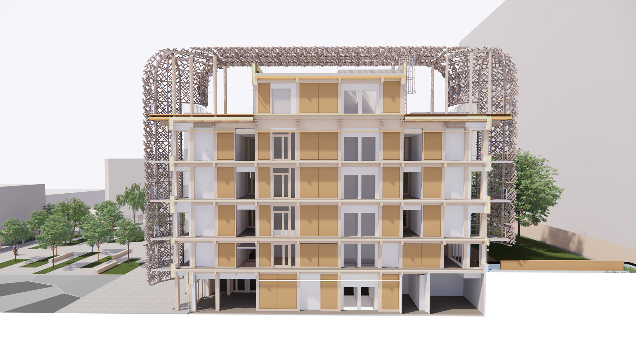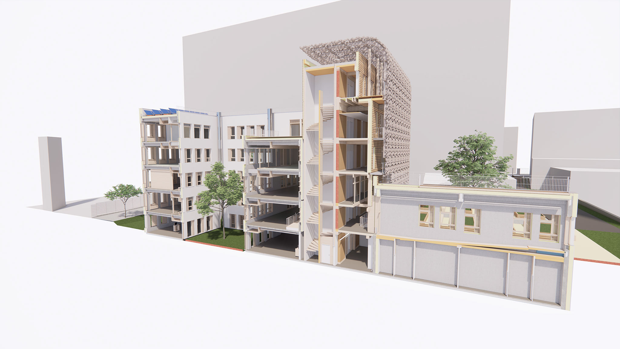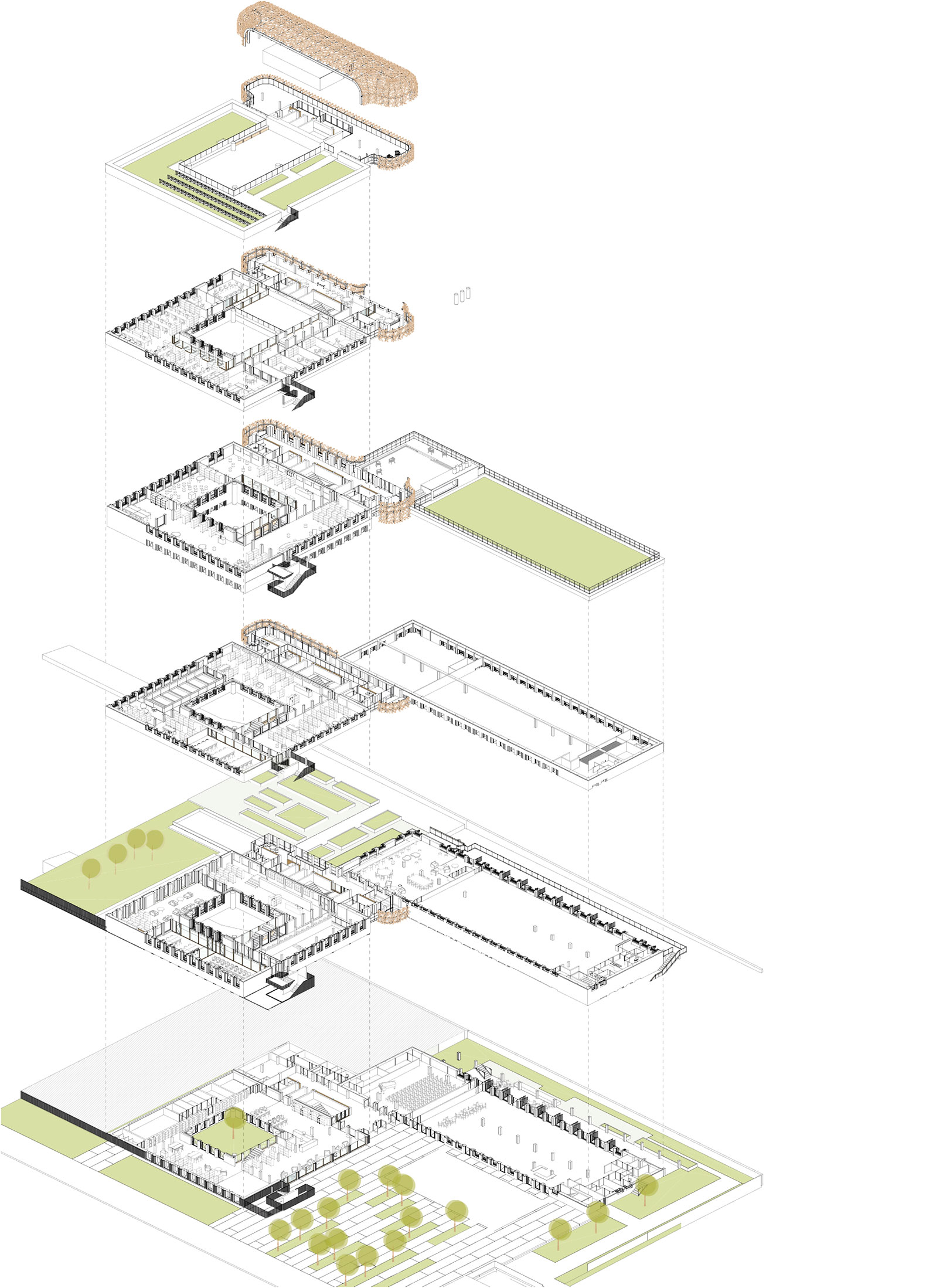 Las estructuras de la antigua escuela secundaria se han conservado, limpiado y se les ha retirado el amianto. Se rehabilitaron elementos prefabricados como postes, vigas, suelos y paneles de fachada de hormigón armado. Se ha llevado a cabo una deconstrucción selectiva de suelos, muros y paneles de fachada de hormigón, y las piezas cortadas se han conservado in situ para su reutilización. Este proceso restauró la regularidad de la estructura y mejoró la calidad del hormigón armado visto. Como resultado, se han creado espacios ideales para una mediateca y un centro de acogida.