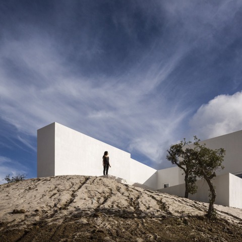 En la cima de Grândola, la casa está diseñada en el balance entre una casa patio, con un núcleo protegido relacionado con el cielo y una apertura con vista a un lejano mar.