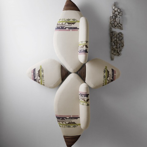 Los tejidos están diseñados combinando tonos similares y luego recomponiendo tiras para jugar con la técnica fondo-figura, con elementos florales.Dos "pufs" completan la composición, creando una flor real que con su geometría permite una multitud de posibles combinaciones.