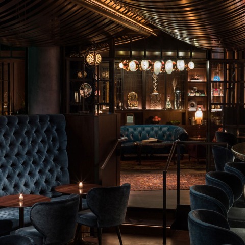 En la parte superior, un conjunto de "cintas" de acero drapeado de diseño personalizado añade dramatismo al espacio y envuelve el equipo mecánico existente que se desplaza por el espacio. Asientos ocasionales cubiertos de terciopelo, pequeñas mesas de cóctel y muebles antiguos completan el interior. La biblioteca, separada del bar principal por un tabique de acero y vidrio y amueblada con una ecléctica mezcla de antigüedades, ofrece un espacio privado para reuniones íntimas. Alfombras vintage, metales patinados, telas lujosas, maderas oscuras (fresno, roble y nogal teñidos), barandillas metálicas personalizadas y paneles decorativos colaboran con la experiencia de inmersión.