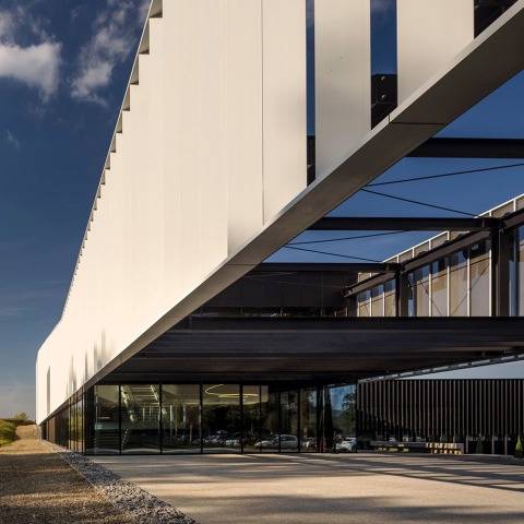 La fábrica de Furla ocupa 42.000 m² de suelo -18.300 m² construidos- y cuenta con tres volúmenes principales (uno para oficinas, dos para laboratorios y logística) diseñados para integrarse armónicamente en el paisaje circundante, sin demasiados contrastes. Arquitectura y naturaleza conviven en un equilibrio funcional.