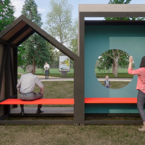 La propuesta utiliza el imaginario común de la cabaña en el árbol para construir estructuras en el espacio público que llamaremos Cabañas, vinculando bosque e infancia.