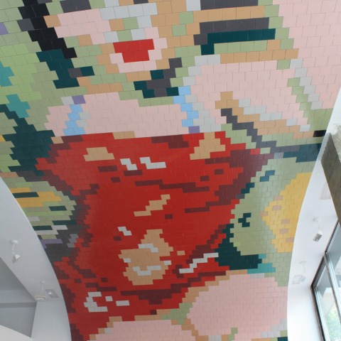 En relación al programa específico de cafetería-bar, se da una alusión directa a este tipo de actividad, o puede que a como nos imaginamos esta función, como un lugar de cruces de miradas, algo vouyerística. Es por esto que sobre la zona de mesas se adapta una de las pinturas de Tamara de Lempicka, ‘The pink tunic’ para descomponerla en multitud de pequeñas piezas cerámicas que como manchas de color abstraen el dibujo original y lo sitúan por encima, en el techo, en una forma de arco, ligeramente abovedada, que se extiende sobre la zona de mesas. Desde el exterior, podemos identificar la forma del dibujo, la podemos observar y acercarnos para aumentar el detalle. Pero una vez dentro, el detalle se pierde, sólo hay manchas de color, y ahora es ella, la imagen descompuesta, la que nos observa a nosotros. Se trata de un juego vouyerístico en el que sólo podemos ganar en la distancia.