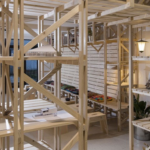 Un andamio es ante todo una estructura, un esqueleto modular y auto soportante que tiene como finalidad servir a la construcción de otra estructura. La nueva cafetería contempla un andamiaje de madera cuya función es tomar distancia del Hall del Pilar. Este andamio conformado por una serie de casilleros de 50x50x50 cm es un separador a la vez que un cuerpo vacío dispuesto para ser llenado de objetos y producciones. Se pensó este lugar desde la necesidad de generar un límite poroso y transparente, una gran vitrina vertical que permite dejar expuesto los recuerdos y el que hacer. Y de esa manera llenar el hall de arquitectura de pequeños objetos significativos que se van sumando en el cotidiano.