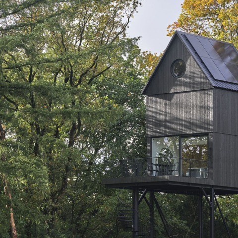 Situada en lo alto sobre esbeltas patas negras y resuelta en su estructura volumétrica, Nest es una casa de vacaciones sorprendentemente cómoda en la que alojarse: literalmente te encuentras entre las copas de los árboles contemplando los brezales en total privacidad. No se puede experimentar la cercanía a la naturaleza a esta altitud en ningún lugar mejor que aquí. El retiro en el campo no es sólo un lugar escondido para quedarse. Nest es verdaderamente inclusivo con la naturaleza y también ofrece un agradable lugar donde alojarse para numerosas aves, «trepadores de árboles» e insectos.