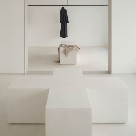 Si bien el empleo de la geometría caracteriza este espacio, también se traslada al resto de salas. Unas contundentes piezas de microterrazo neutro y volumen puro ordenan el espacio y permiten realzar los productos allí expuestos. Por su parte, los pasos entre salas quedan enmarcados por medio de un revestimiento de piedra local valenciana, un gesto que enfatiza la contundencia geométrica de las transiciones y acentúa su profundidad.
