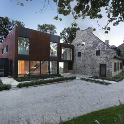 Esto lleva a la idea de marcar un paralelo entre el componente multi-generacional del programa y el hecho de que un proyecto contemporáneo se construye junto a una casa histórica. De esta manera, el diseño expresa el paso del tiempo. La estrategia se define a sí misma como un proyecto contemporáneo, contrastando la casa de piedra existente, pero que tiene una relación evidente con el hogar ancestral. Esta idea se extiende a la forma en que los espacios se definen, como las dos salas de estar a doble altura que se encuentran en extremos opuestos, una en cada volumen, unidas por un camino resaltado por un puente que une la vieja casa con el nuevo volumen.
