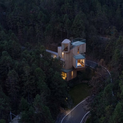 La casa del árbol, un pequeño hotel diseñado por un estudio de arquitectura de Shanghai, Bengo Studio, trata de dialogar con su entorno de cedros rojos, dejando la menor huella sobre el bosque. La altura y los materiales responden a esta idea y tratan de dejar la menor traza ecológica sobre el medio natural de las montañas de Huangshan.