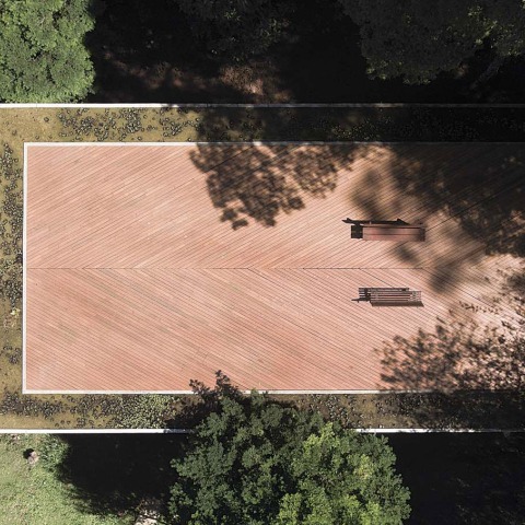 Así como la siempre conocida arquitectura de la posguerra brasileña, desde Artigas hasta Mendes da Rocha, aquí también el techo de hormigón desempeña un papel crucial en la determinación del proyecto tanto en la articulación de su programa como en la caracterización de su apariencia exterior einterior. Es una losa rectangular de 15 cm de altura sostenida por ocho pilares de extremidades largas que, aunque "básica" en su resolución formal, se distingue por la extraña delgadez de sus partes constitutivas. Al acercarse a la casa desde la carretera principal, es la cara superior de este elemento la que se presenta al espectador que ofrece acceso a una plataforma de observación monumental de ca. 20 por 10 metros, inmersos en el follaje de las copas de los árboles circundantes. En lugar de un parapeto, la cubierta está rodeada por un lecho de agua de un metro de ancho que, a su vez, define una isla central rectangular desde la cual contemplar la vista. Este último está forrado con tablas de madera de Garapeira finamente cortadas que se encuentran en diagonal contra la línea de simetría de la cubierta y apuntan hacia el horizonte.