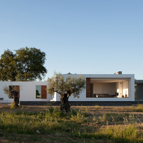 Esta vivienda de fin de semana para una familia de cuatro miembros está ubicada en Santarém, Portugal. Organizada en forma de L, en el que los arquitectos pretenden combinar una vivienda con características urbanas desplegada en un entorno rural.
