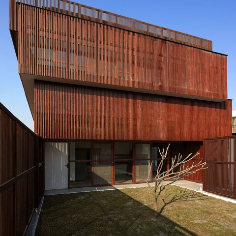 El edificio diseñado por el estudio Sameep Pandora & associates consta de dos plantas, cubiertas por una segunda fachada de lamas de madera. Estos elementos, además de servir de foco visual urbano, colaboran en el impacto del fuerte soleamiento indio. Cada uno de los niveles funciona como una vivienda independiente, con una distribución de salas que orienta hacia el gran patio interior los espacios de reunión (cocina, comedor, sala de estar).