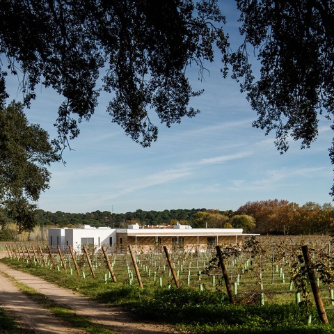 Diseñada por Blaanc, la casa está construida en medio de la viña en un terreno casi plano junto a un bosque de alcornoques. La calma y la serenidad de los alrededores da la bienvenida a un edificio de una sola planta que trata de interferir lo menos posible con el paisaje alineándose junto a los elementos naturales que componen el paisaje.