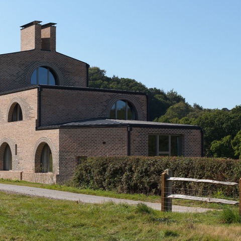 La casa está construida con hormigón estructural y envuelta en una gruesa piel de ladrillo con un techo de zinc negro. El perfil de la casa asciende en un movimiento escalonado, elevándose desde una entrada de un solo piso en el alzado norte hasta una torre de tres pisos, que se expresa como una cuadrícula en el alzado sur. Las aberturas de ventanas de ladrillo arqueado con revelaciones profundas dan cadencia a las elevaciones laterales largas, expresando el peso de las paredes. La sensación de movimiento que crea esta forma escalonada se ve acentuada por la pátina de la piel de ladrillo; ladrillos ennegrecidos alrededor de las aberturas de ventanas de ladrillo arqueado crean una ilusión óptica, un rastro de movimiento a través del espacio.