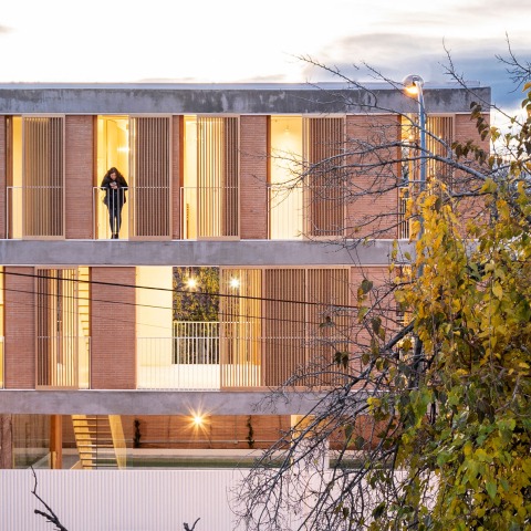 Así, la planta baja queda definida por el muro perimetral de ladrillo visto en el que apoya la casa, el cual también sirve de soporte para que crezcan las parras, hiedras y jazmines que aportarán olores y colores cambiantes a lo largo del año. En los niveles superiores, el ladrillo visto se emplea como material estructural en los testeros medianeros para sujetar las losas postesadas de hormigón armado que liberan las plantas. Mientras, en los frentes longitudinales, el muro de ladrillo se desdobla al carecer éste de su sentido estructural, entendiéndose como una fachada estratificada que permite alojar en su interior las carpinterías correderas de madera de alerce que conforman los huecos. A nivel energético, la gran inercia térmica del conjunto, unida a la ventilación natural y protección solar regulable de todas las estancias, junto con el uso de un suelo radiante-refrescante con producción de energía aerotérmica, aseguran el reducido consumo energético de la vivienda.