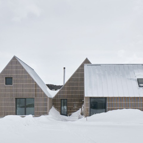 Tres volúmenes con formas idénticas de diferentes tamaños y orientaciones se conectan lado a lado sin que se crucen. Juntos, forman un conjunto poco común pero coherente. La forma de la casa cambia constantemente a medida que se mueve alrededor de ella, mientras se mantiene siempre clara e inteligible. Tres patios circundantes forman una plaza alrededor de la casa. El techo de metal con una fuerte pendiente y la fachada de celosía profunda hacen eco de las construcciones cercanas.