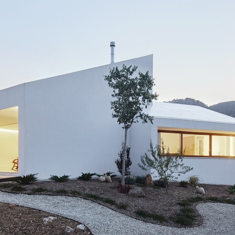 Esta vivienda busca la máxima eficiencia energética adaptándose al programa, las orientaciones solares, las vistas y la pendiente del terreno. El proyecto optimiza el programa agrupándolo en cuatro cajas -cocina, estar/comedor, habitación principal y habitaciones de invitados- que pueden funcionar en conjunto o independientemente. Cada una de las cajas se coloca cuidadosamente sobre el terreno y gira sobre su eje con precisión para buscar las mejores vistas y la mejor orientación según su uso. Las habitaciones se orientan a Este, al jardín y al Castillo de Bellver; la zona de estar y comedor a Sureste, al mar y al jardín; la cocina se orienta a Sur y a la huerta; y, en el altillo sobre el salón, la terraza mirador se orienta hacia las vistas sobre el mar y cuenta con un ventanal sobre el salón orientado a Sur permitiendo que el sol de invierno caliente la zona principal de la vivienda mientras que un retranqueo del ventanal protege del sol en verano.