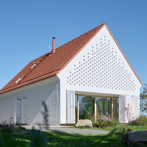 La propuesta de Jan Žaloudek Architekt vincula la casa con el movimiento de la luz solar. En la planta baja, el dormitorio y la sala de estar tienen una vista panorámica al huerto, donde se pueden contemplar la salida del sol y de la luna. En la fachada oeste, el acceso conserva la intimidad de la vivienda frente a las visitas del pueblo, mientras que la fachada sur conecta el espacio social con el patio y las ruinas del granero. En el lado norte, el dormitorio, el baño y los espacios de servicio de la planta baja quedan iluminados por el nicho abovedado de la fachada. Además, la entrada de luz natural al interior puede ser regulada a lo largo del día mediante paneles de sombreado blancos que funcionan como celosías.