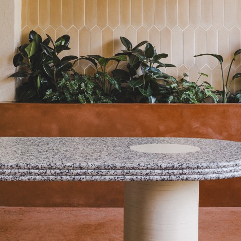 En primer lugar, la barra, uno de los elementos más característicos del café de especialidad, se ubica en el extremo trasero y se le dota de gran carga expresiva ya que se recubre por completo con granito. Funciona como telón de fondo y, a la vez, como lugar de referencia. Por su parte, el resto del espacio queda rodeado en tres de sus lados por una bancada perimetral que recibe el mobiliario. Este gesto persigue tres claros objetivos: aporta unidad al conjunto, libera el espacio central y ensalza la amplitud de la sala.