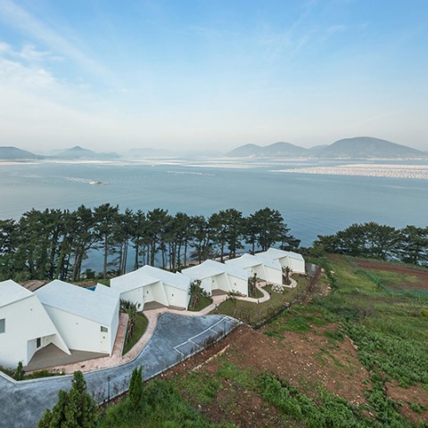 Cinco edificios blancos escultóricos, descansan al borde de un acantilado en la costa sur de la isla de Geoje, Corea del Sur. Las paredes blancas se pliegan en sí mismas para crear una visión privada del mar desde cada casa. Grandes pinos que crecen entre las viviendas ayudan a enmarcar vistas del mar. Este es el segundo resort para el grupo de alojamientos, llamado "Casa de la Mente."