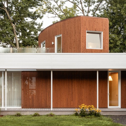 En la parte delantera, en la planta baja, un gran ventanal cubierto con lamas de cedro espaciadas le da a la fachada un efecto semitransparente, al tiempo que protege la privacidad de los ocupantes. Los grandes paneles de listones se deslizan hacia afuera, lo que permite a los ocupantes abrir o cerrar la fachada que da a la calle. En la posición abierta, un panel deslizante también brinda privacidad a la terraza con vista al lago.