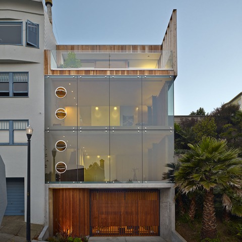 Situada en una pronunciada colina al borde de un jardín público, sobre el parque Dolores en San Francisco, esta casa decididamente pequeña de sólo 1.800 pies cuadrados se construye sobre la inclinada ladera de la manera más eficiente posible.