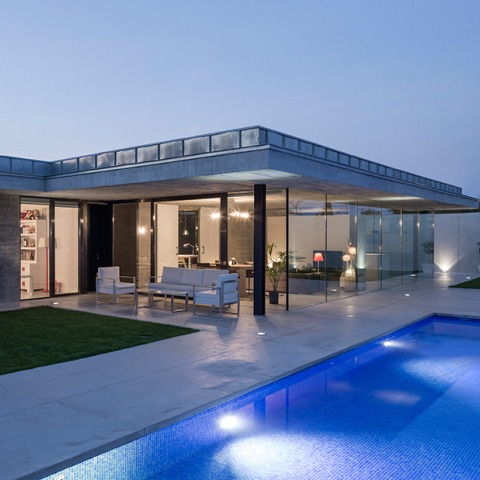 La vivienda se plantea para uso y disfrute de la parcela en su totalidad, llevando el programa a sus límites. La parcela es un rectángulo ubicado al fondo de un ‘cul-de-sac’. El acceso se produce en esquina, entre el volumen de la vivienda y el de un pabellón auxiliar. El vuelo de la losa de este último protege la entrada.