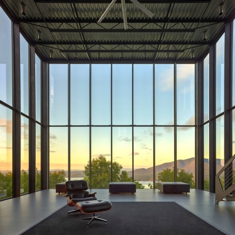 La vivienda, diseñada por Jay Bargmann, vicepresidente de Rafael Viñoly Architects; organiza los espacios interiores se en dos plantas, que a su vez presentan una relación diferente con las vistas hacia el entorno: la planta baja presenta unas vistas de un entorno más próximo: copas de árboles, embalse... mientras que en la primera planta, gracias a su posición más elevada, se puede disfrutar de vistas hasta el horizonte.