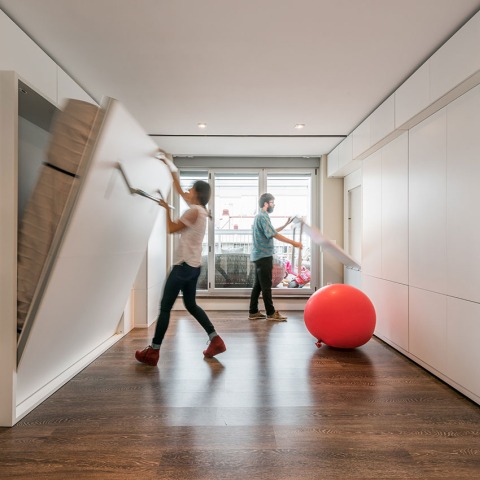 A partir de una pared móvil motorizada de 4 metros y medio, ese dormitorio extra aparece y desaparece con sólo pulsar un botón y con el tiempo se ha convertido en el despacho de Michael o Stella cuando vuelven a casa aún con trabajo por hacer, en mesa-comedor plegable por la zona del salón y habitación de juegos para los peques al mismo tiempo. La habitación de invitados aparece sólo durante la noche e incluso durante el día puede reducir su tamaño para convertirse en un simple ropero en el que pueden cambiarse las visitas.