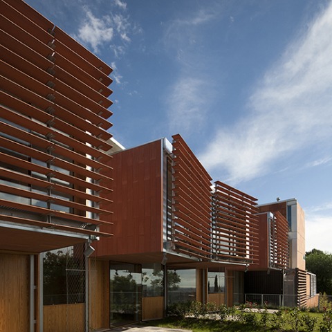 La mayor presencia de las viviendas desde la calle son cuatro volúmenes, cuatro módulos, autónomos, industrializados. Una única cubierta ajardinada recoge la volumetría de los módulos. Son estos módulos los que generan y delimitan el espacio interior y exterior de la vivienda, aportando una complejidad volumétrica y espacial así como proporcionado visuales muy diversas, tanto des del exterior como des del interior.