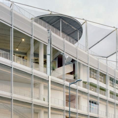 El edificio está diseñado como un conjunto simple de losas, vigas y columnas de hormigón con bajas emisiones de carbono. Sus espacios exteriores superpuestos se mezclan con la lógica urbana del distrito, como calles y plazas grandes y pequeñas rodeadas por redes agrícolas cortavientos que protegen a los usuarios de las corrientes de aire. El conjunto “respira”, de forma natural, y los elementos construidos, es decir, la calefacción, el aire acondicionado, la ventilación y la iluminación artificial, se reducen al mínimo para ganar al máximo en ligereza y economía. En total, se ahorran 900.000 kWh/año, o una reducción del consumo del 56% respecto al mismo proyecto si se tratara de un recinto cubierto y un ahorro de 2.270 t CO2 o un 63% de CO2 ligado a su construcción.