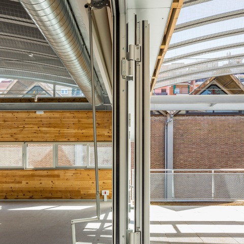 El edificio se plantea con una construcción ligera industrializada en sus elementos estructurales y de envolvente. Tenían que ser sistemas que pudiesen ser conformados en taller y ensamblados en obra. La decisión tenía que suponer ventajas de efectividad, de disminución de residuos y de control en la calidad y los recursos, tanto en el proceso de fabricación como en la colocación en obra. El proyecto propone una estructura metálica que cubre grandes luces y una cubierta de chapa grecada curva autoportante y multicapa, que arquitectónicamente quiere recordar a la bóveda catalana. Las fachadas son de paneles de madera contralaminada de gran formato con aislamiento y acabados integrados. En el este y oeste la presencia la tiene la vegetación.