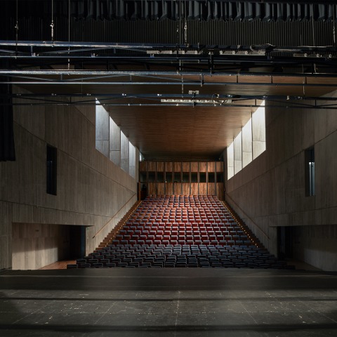 La característica más acusada de la intervención es la propuesta de un muro de doble hoja que contiene los elementos de circulación y permite introducir luz natural a través de él. La tensión del proyecto se produce entre los espacios de comunicación alojados en el intersticio entre los dos muros y los espacios públicos que ocupan los vacíos creados en el interior. El foyer, espacio de encuentro entre el centro cívico y la sala, está iluminado cenitalmente y tamizado con un velo de listones de madera que se desliza hasta el suelo.