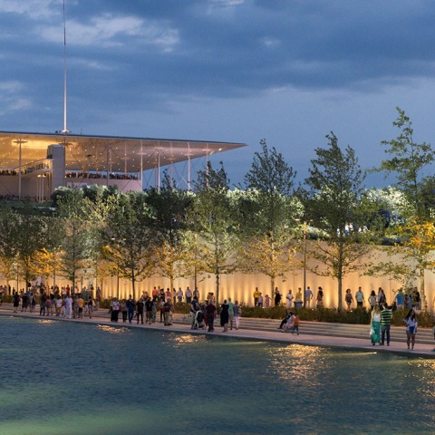 La conexión visual con el agua sigue el parque, en el que se centran un canal al lado de la explanada, los principales ejes peatonales del sitio, en la dirección norte-sur.