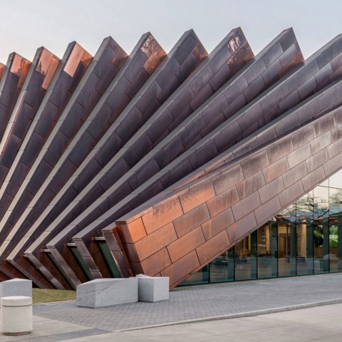 El exterior del edificio está revestido de cobre, y fue pensado para que la exposición prolongada a las inclemencias del tiempo naturalmente degrade al metal desde un ocre oscuro hasta una pátina duradera. Envuelto en pilares rectos y verticales que se inclinan gradualmente hacia abajo, crea una apariencia inconfundible sin ningún elemento curvo.