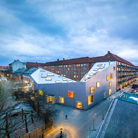 La casa de la cultura para niños ofrece varias instalaciones para jugar y programas para niños de todas las edades. Localizado en una esquina de una calle, la estructura se sitúa entre varios edificios antiguos de ladrillo, que tienen una altura diferente. En su forma y uso de materiales, sin embargo, el nuevo centro es bastante distinto. Una piel de aluminio perforada por ventanas cuadradas es dibujada en el tejado y paredes exteriores y la altura menor en la esquina permite la entrada de la luz solar en el patio interior. La expresión de la Casa de la Cultura para niños es sorprendente e imaginativa: el tejado y las fachadas son tratadas por igual, y la Casa no tiene un "comienzo" o un "final" como lo tienen las casas corrientes. El interior está organizado como un pueblo de montaña - suministrando un número de experiencias espaciales y fascinantes vínculos visuales. Una importante contribución al diseño era la serie de talleres que permiten a los niños desarrollar sus propias ideas en la Casa de la Cultura para niños de Amager.