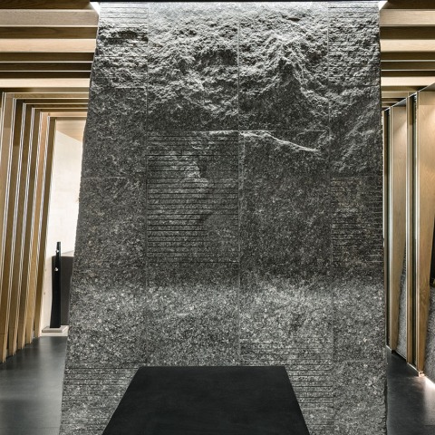 Al abrirse las puertas del elevador, nos recibe un gran monolito de granito, inspirado en un horreo gallego donde solo se ilumina discretamente el nombre del restaurante. La textura rugosa de la piedra miracema se suaviza por medio del rayado artesanal que se realizó aleatoriamente en ella.