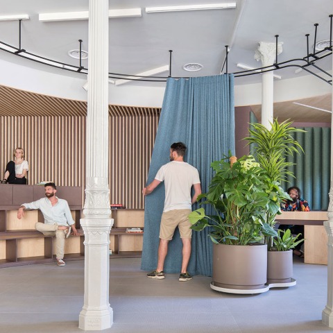 Los espacios cerrados se reducen al máximo, como la cabina aislada para conversaciones telefónicas, acristalada y siempre visible o las salas de reuniones, una más formal y representativa, presidida por un brumoso bosque gallego y una más pequeña y dinámica que se incorpora al espacio común mediante un sistema de puertas plegables.