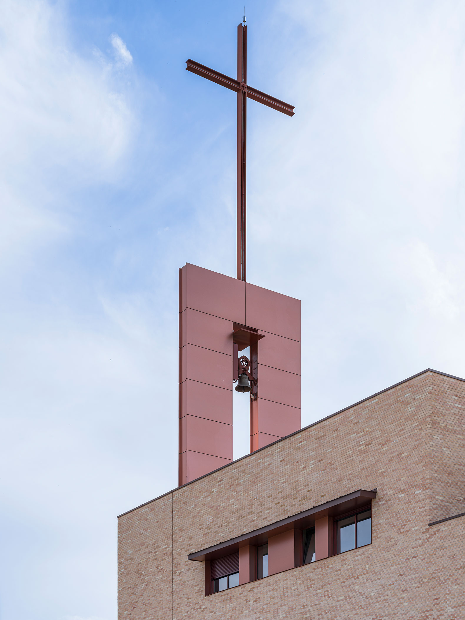 En la esquina sudoeste se ha proyectado, elevándose por encima de las cotas de cubierta la estructura que alberga el campanario y la cruz. Su altura y posición significan la presencia del Centro Parroquial en el lugar y es, junto la ligera elevación de la cubierta del templo, el único elemento que destaca sobre la rigurosa volumetría del edificio.