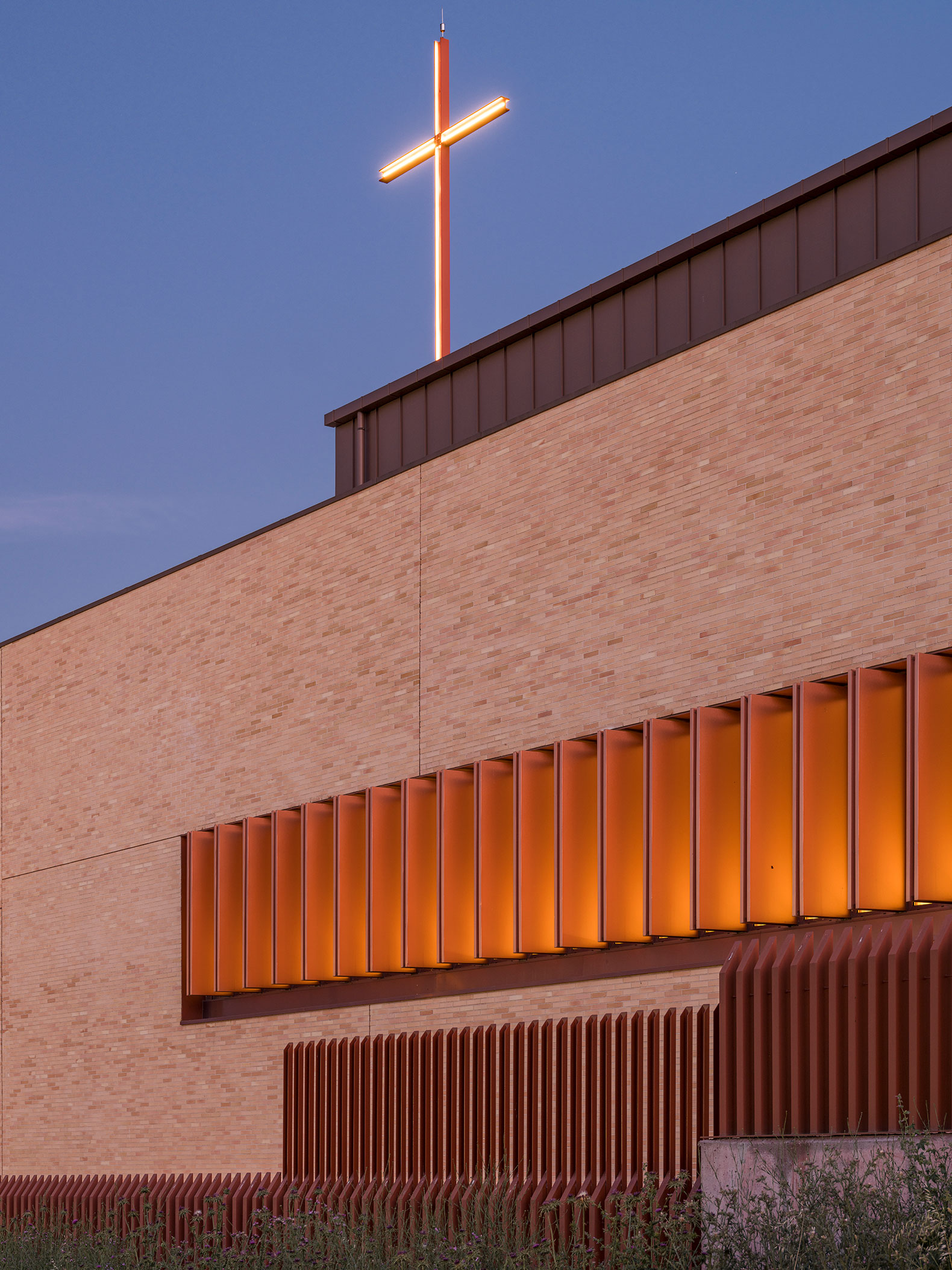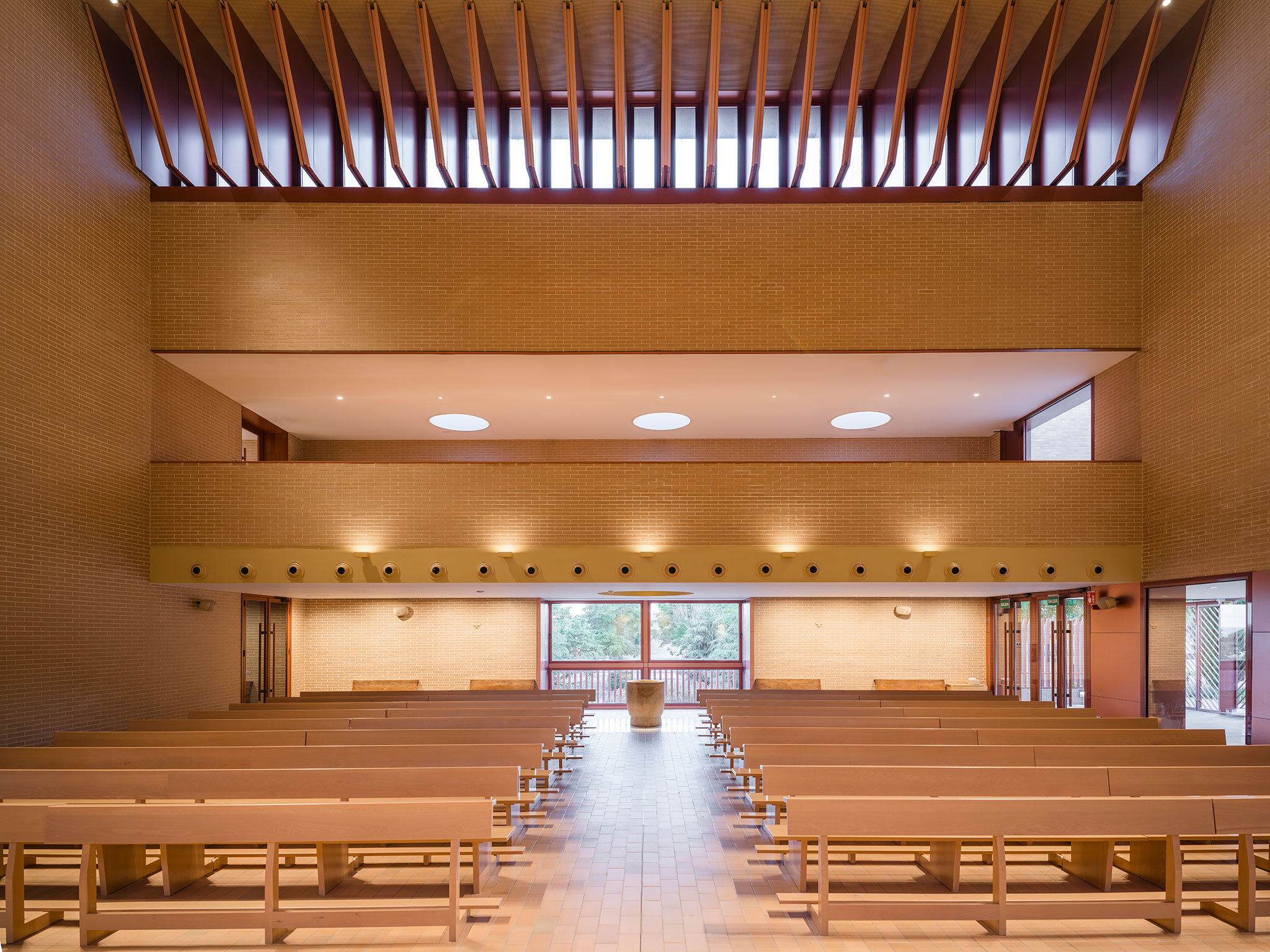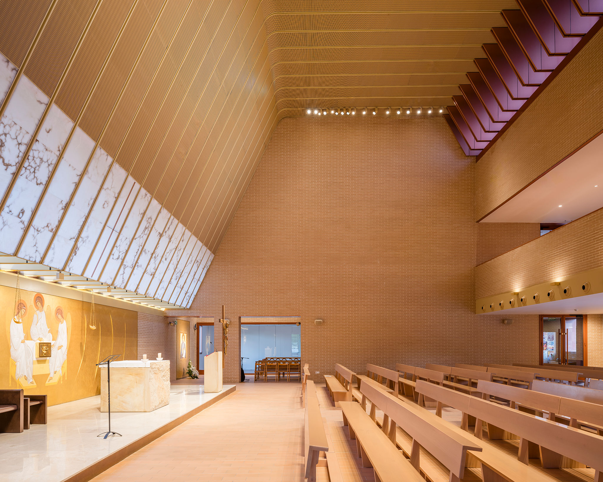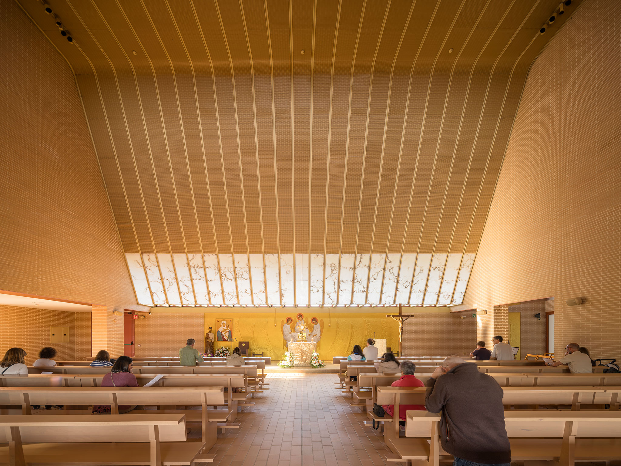 Al interior, un cuidado estudio de la luz y los espacios cualifica el espacio sacro y crea un ambiente agradable para las distintas estancias.