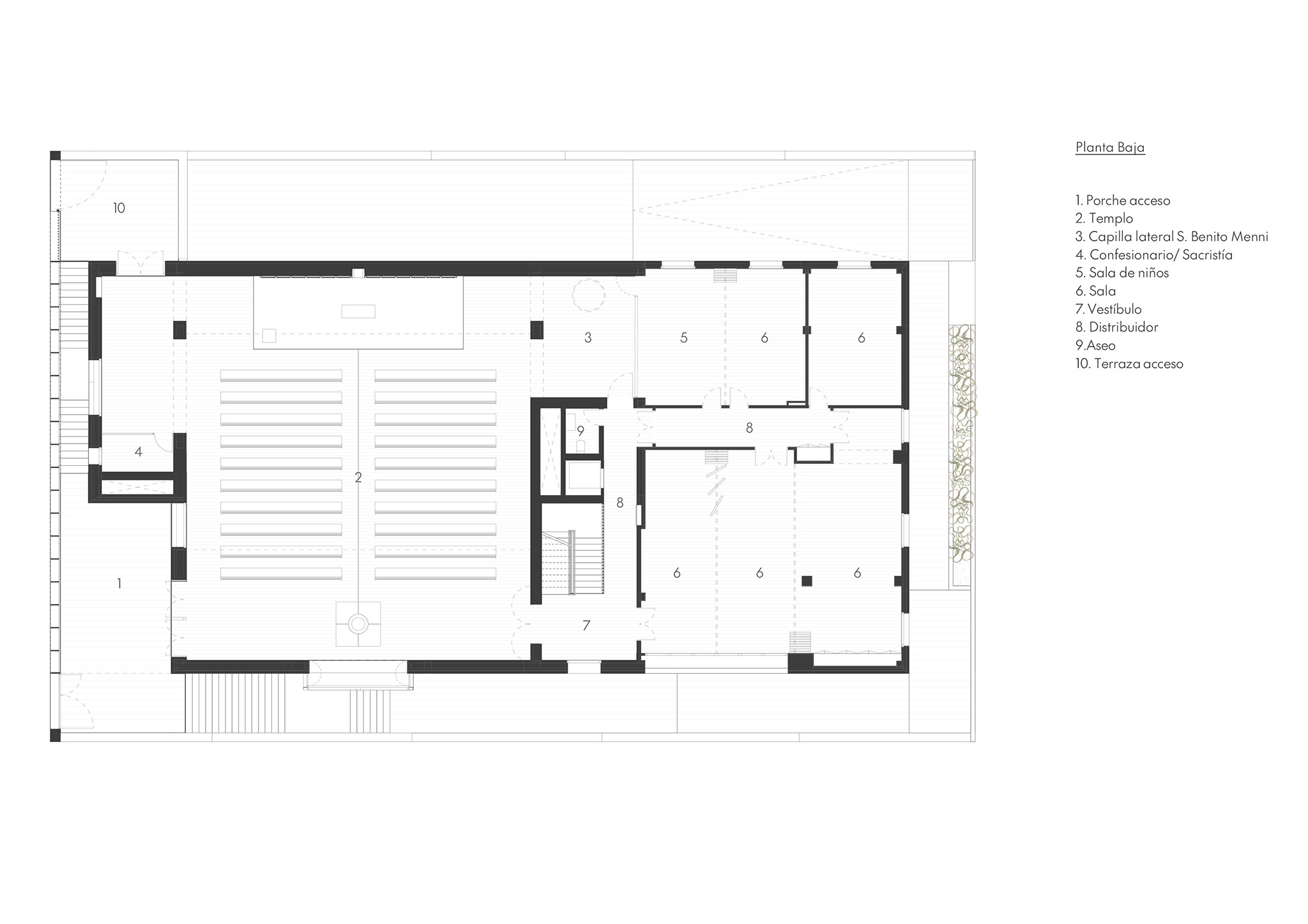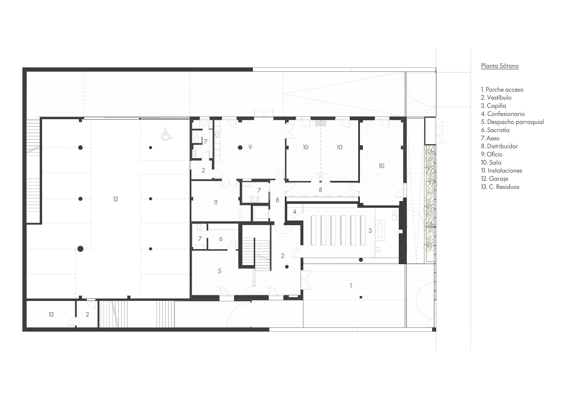 Desde el nivel inferior se accede también al garaje ubicado bajo el espacio del templo.