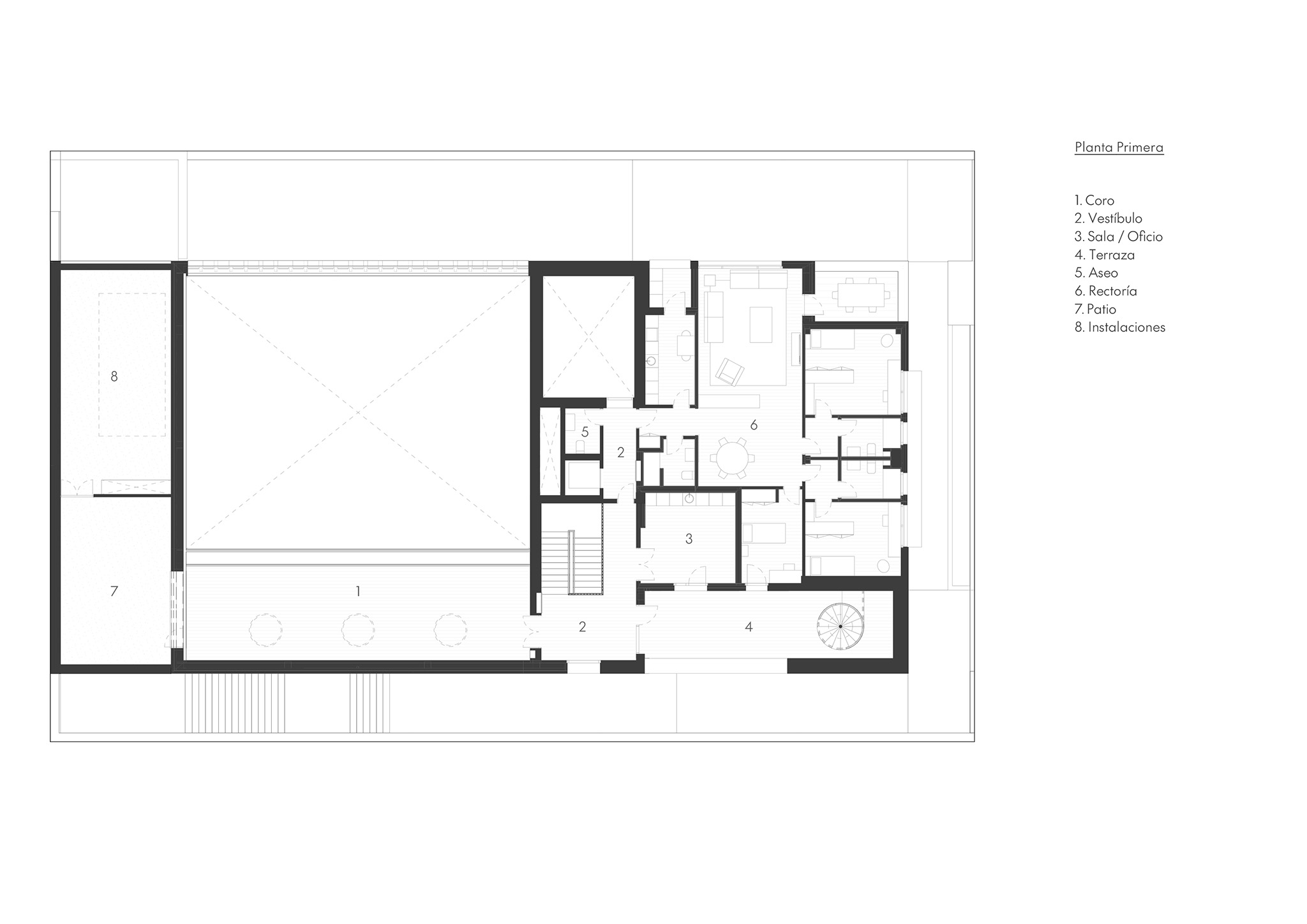 Vinculado al nivel inferior, y con acceso desde la calle Catorce Olivas a través de otro porche cubierto, se distribuye el resto del programa (capilla, salas de reunión, despacho parroquial y rectoría). La posición de la capilla y algunas salas en este nivel permiten un funcionamiento parcial del complejo cuando las necesidades de uso no demandan la apertura del resto de espacios en otras plantas.