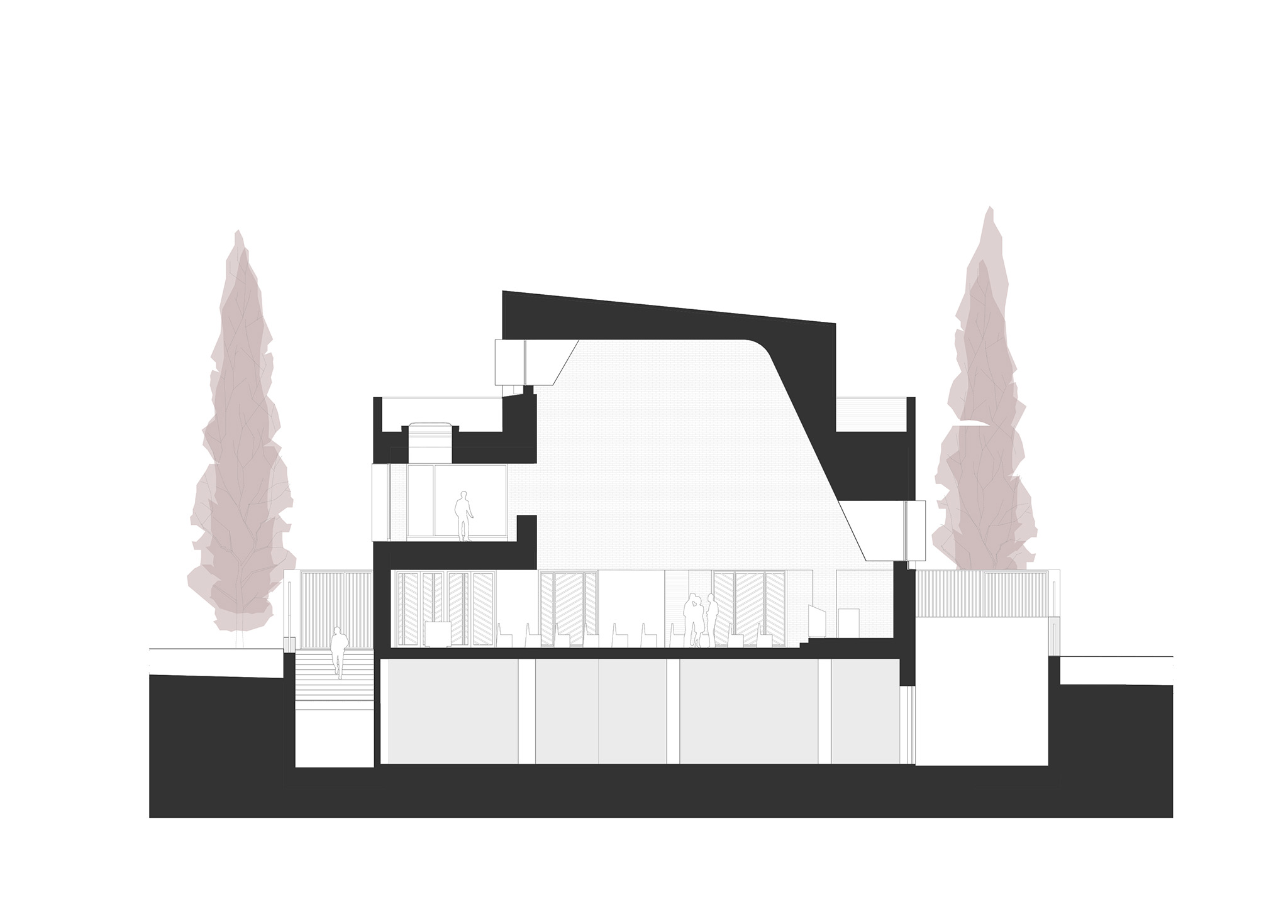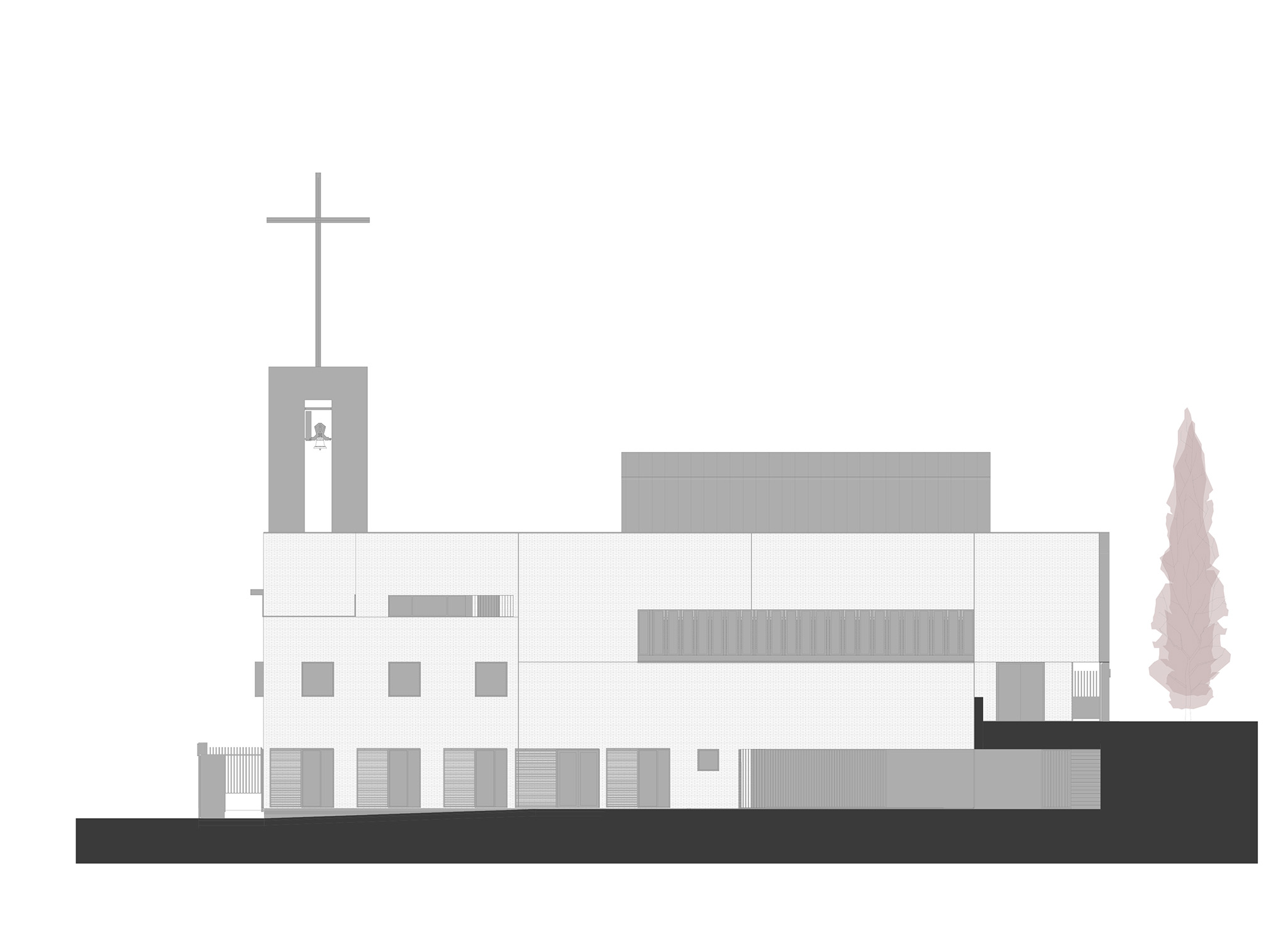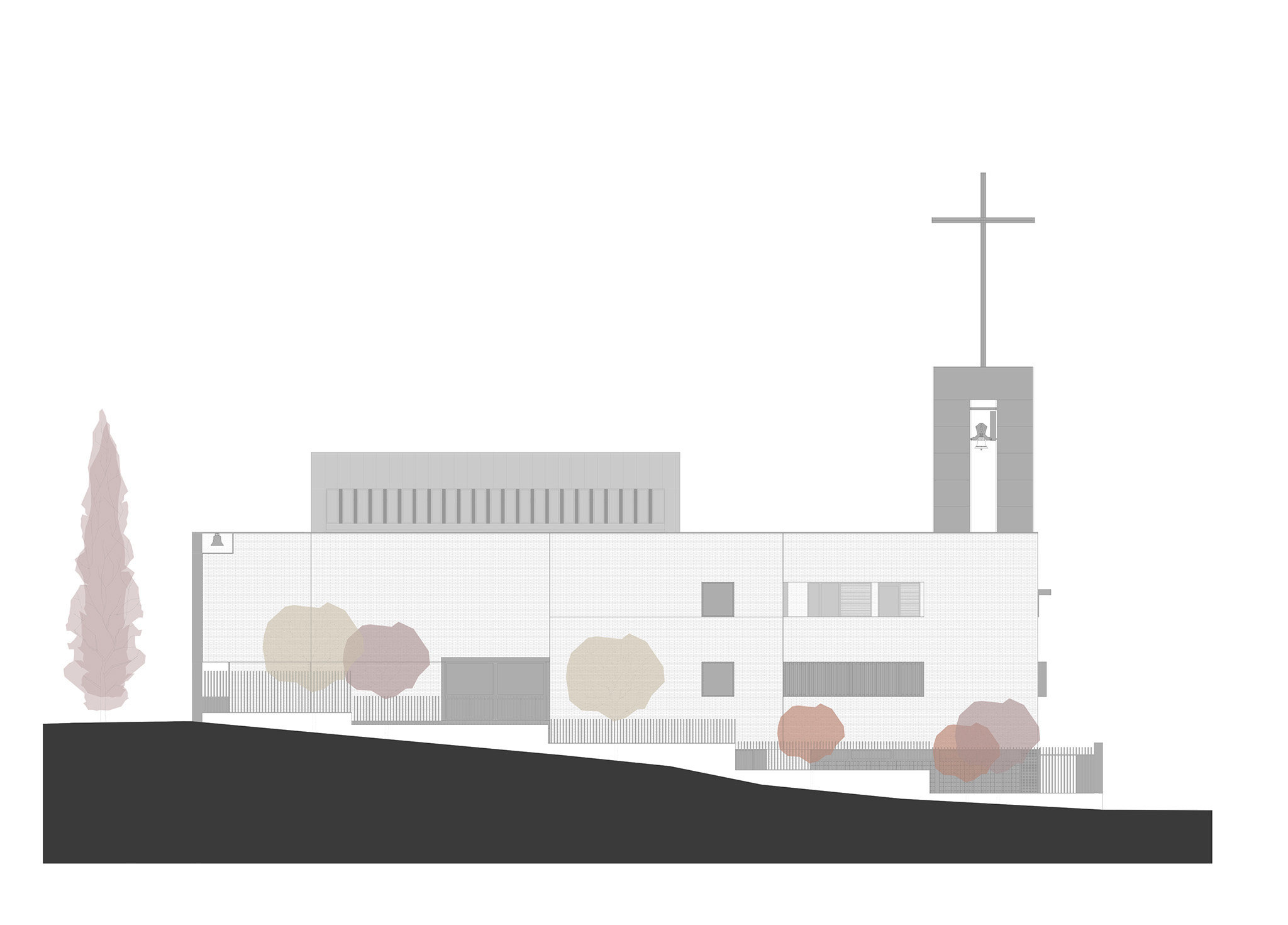 El desnivel existente, la posición de accesos a distinta cota y la necesidad de acometer una actuación por fases (que permitió mantener durante las obras la construcción provisional que albergaba la parroquia anterior) son condicionantes que están detrás de la decisión de conformar el edificio en dos zonas articuladas en torno a una crujía central de comunicaciones y servicios.
