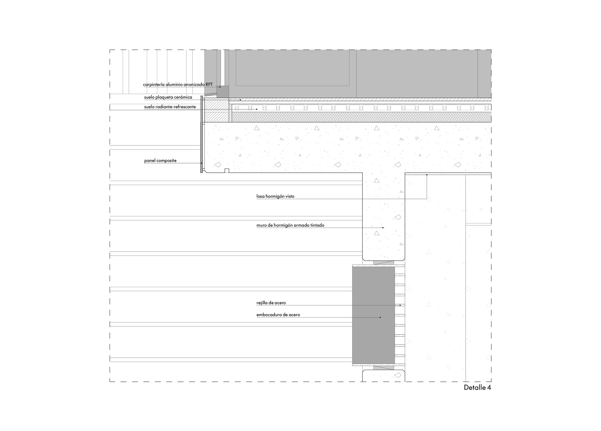 El tratamiento de los espacios libres se ha proyectado con la idea de permitir la comunicación entre todos ellos. De este modo es posible rodear perimetralmente todo el edificio, comunicando los distintos niveles y espacios exteriores de tal modo que se facilita el uso del reducido espacio libre que resulta de las condiciones de posición de la edificación.