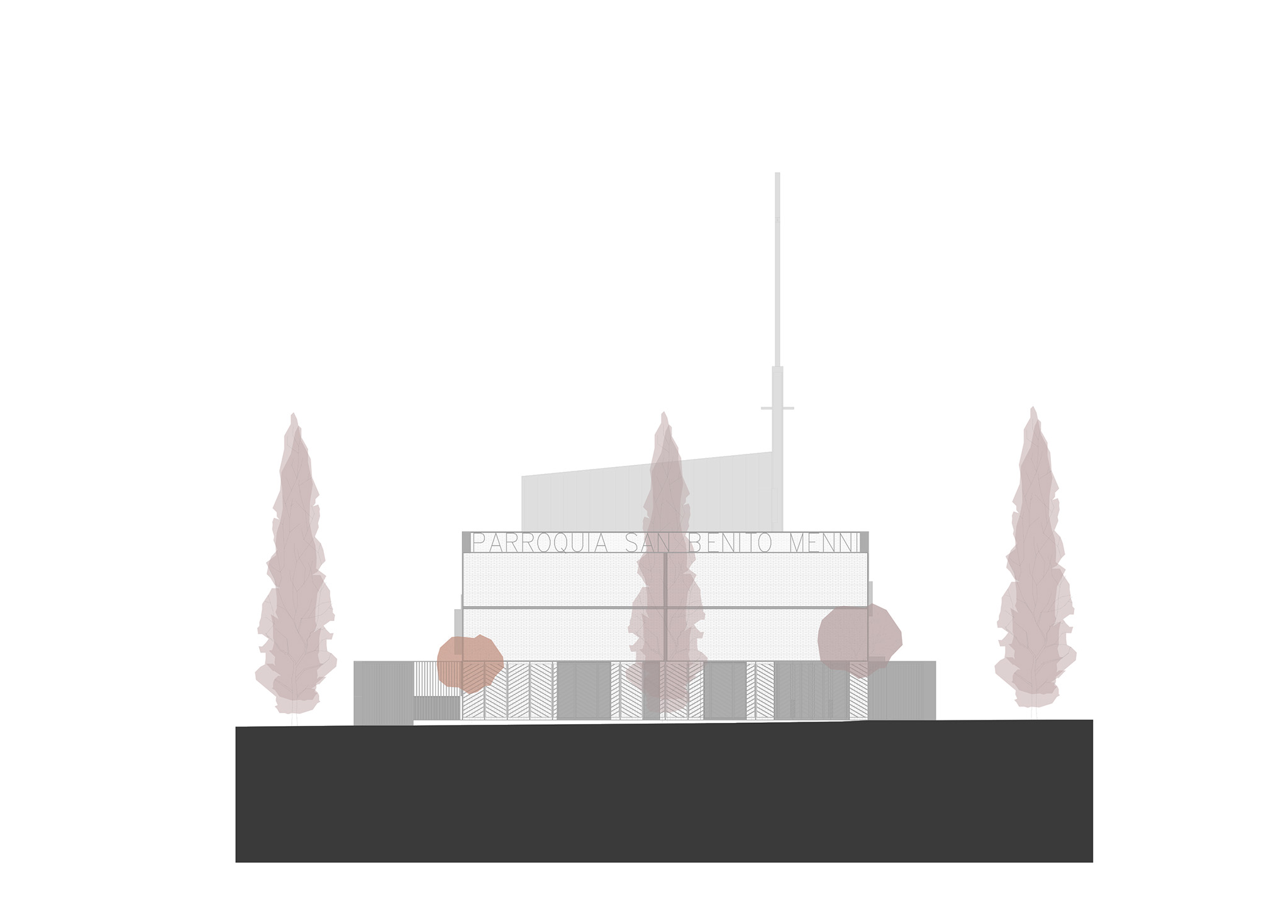 El proyecto de parroquia de tresunonuo se muestra exteriormente con una fachada sencilla que sirve de lienzo al entorno arbolado cercano. Una gran cruz elevada corona la composición volumétrica destacando el carácter religioso del edificio. Puertas adentro, un cuidadoso tratamiento de las luces y sombras, cualifica el espacio, creando un ambiente sacro y acogedor.