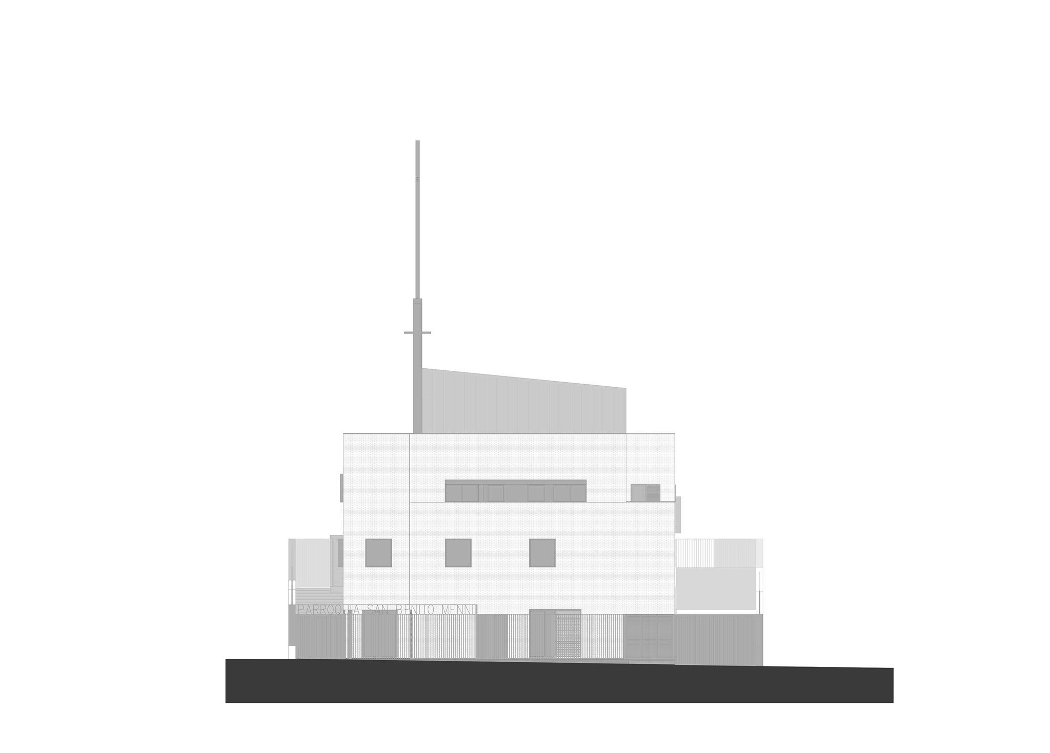 Una fachada sencilla, pensada como fondo visual del arbolado que jalona el paseo, integra en la propia fábrica una gran cruz que compone una fachada rematada con un elemento de coronación con la rotulación del complejo.