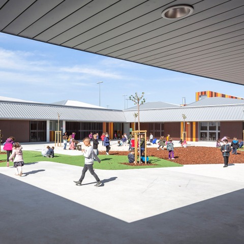 Las aulas de la escuela se basan en un módulo de 9x7,2 metros, y cada volumen se eleva en una de las esquinas generando un espacio de cubiertas articulado y diverso, donde un lucernario por aula, llena el espacio con luz natural y, junto con las ventanas que dan al patio, proporciona ventilación cruzada. Esta solución se extiende a otros espacios interiores como la sala de psicomotricidad y el comedor.