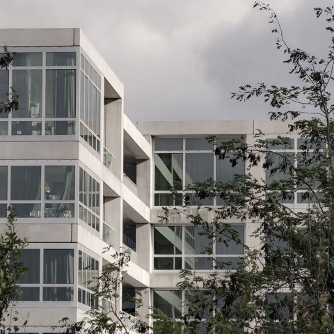 Hacia el noroeste, el volumen de viviendas más grande se desarrolla alrededor de un espacioso patio con árboles, donde pasarelas externas con vista al entorno verde brindan acceso a los apartamentos de doble aspecto. Inspirada en la tradición de la arquitectura residencial holandesa, esta solución de circulación se adapta a su contexto y minimiza las conexiones verticales, permitiendo diversas configuraciones a las unidades de vivienda, desde espacios privados al aire libre hasta logias con áreas de estar. Además, estas anomalías de orientación están flanqueadas por pozos de luz que difunden la luz natural a los pisos inferiores: una ruptura vertical que genera espacios informales para fomentar la socialización de los residentes.