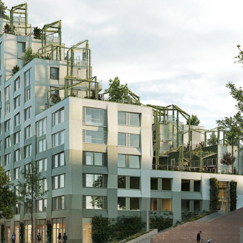 El proyecto arquitectónico integra biodiversidad de forma innovadora. El edificio se concibe como un ecosistema que responde a su contexto. Con una escala más pequeña hacia el vecindario de Bospolder/Tussendijken y una fachada metropolitana orientada hacia M4H, el complejo reacciona a su entorno urbano mientras da la bienvenida a la naturaleza en su diseño. Fachadas verdes, pérgolas y jardines no solo embellecen el edificio, sino que también invitan a aves y otras especies, mientras ofrecen a los residentes un entorno acogedor y sostenible.